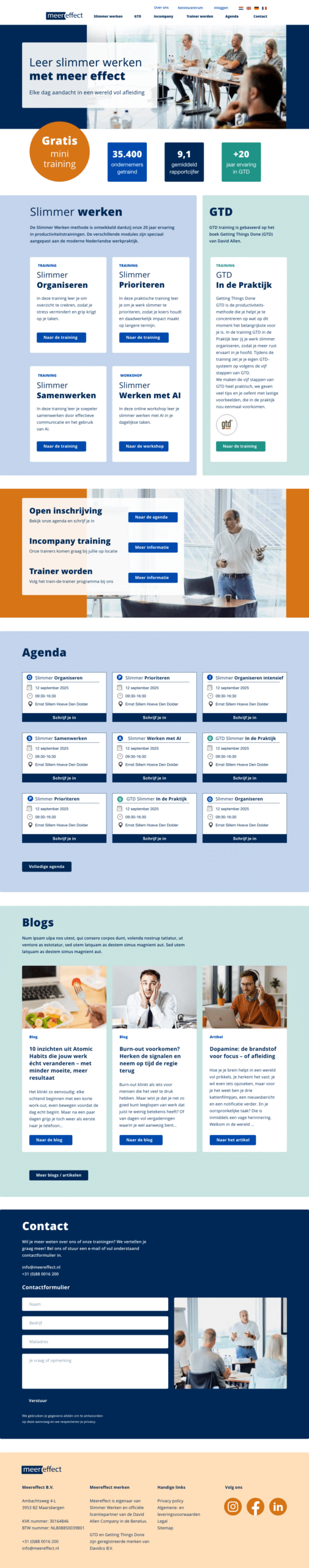 Meereffect is een Nederlands trainingsbureau dat zich richt op productiviteit en “slimmer werken”, vooral voor kenniswerkers in de Benelux. Ze zijn officiële licentiepartner voor de methode Getting Things Done (GTD) van David Allen in de Benelux en geven trainingen, coaching en workshops om mensen grip, overzicht en rust in hun werk te laten krijgen.